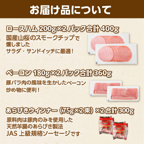 - 【ふるさと納税】ハム・ベーコン・ウインナー詰合せ 栃木県 那須塩原市 豚肉 セット 薄切りハム 薄切りベーコン 国産山桜 スモークチップ 天然羊腸 あらびき 朝食 サラダ サンドイッチ 送料無料