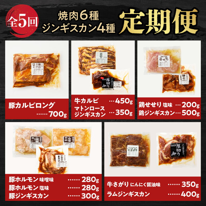 - 【ふるさと納税】全5回 定期便 焼肉 6種 ジンギスカン 4種 セット 3.8kg超 焼き肉 肉 牛 豚 鶏 羊 ラム マトン ロース 味付き サガリ カルビ せせり ホルモン 厚切り 惣菜 冷凍 大容量 ボリューム 定期 北海道 樽前工房 苫小牧市 おすすめ ランキング プレゼント ギフト