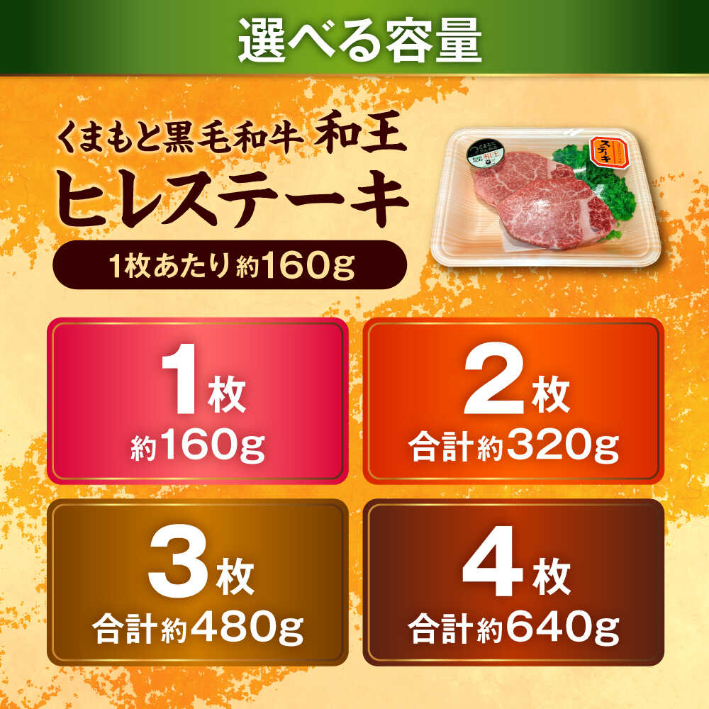 【ふるさと納税】《選べる容量!》くまもと 黒毛和牛 和王 ヒレ ステーキ 約160g~640g(約160g×1~4枚)【菊池地域農業協同組合】[AYBR018]
