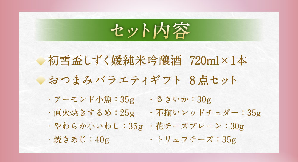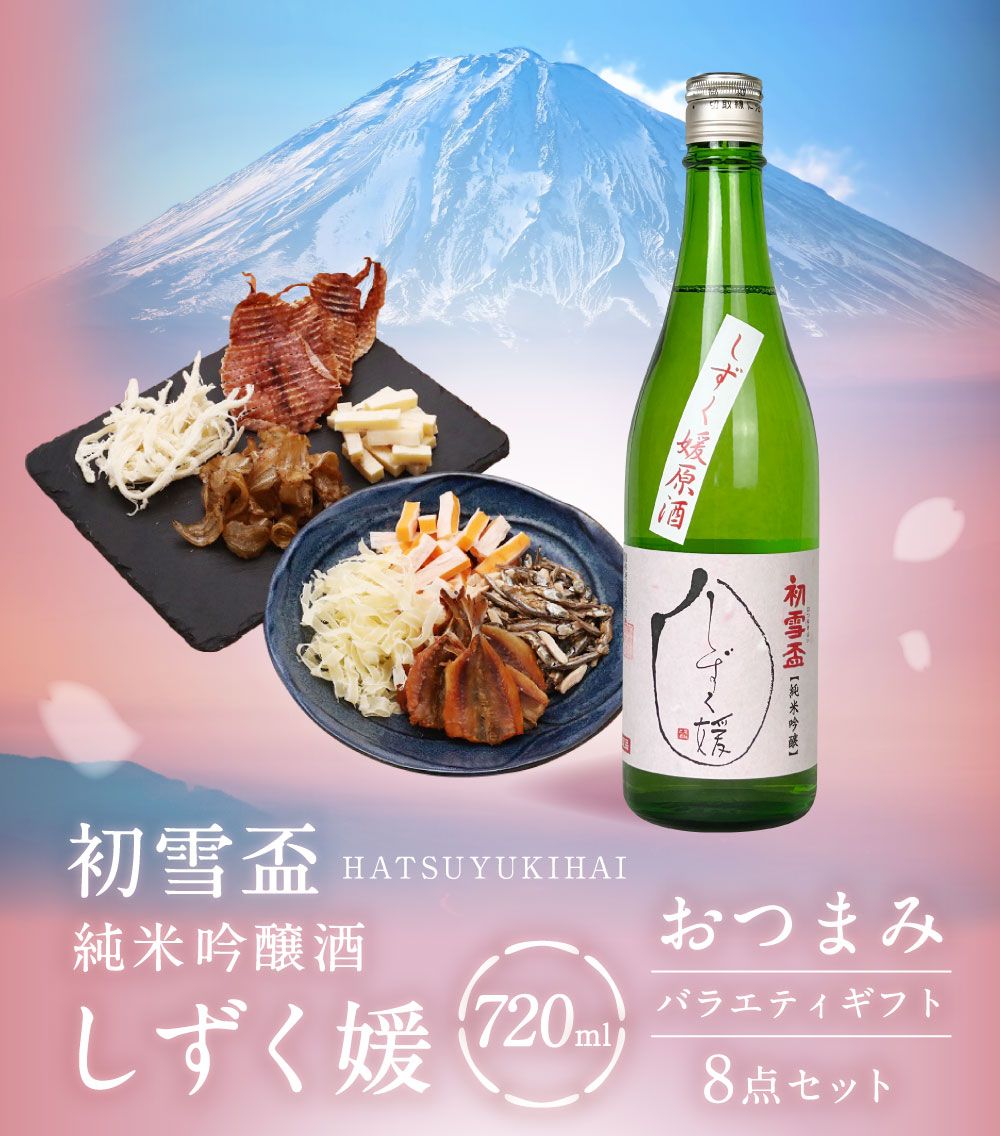 - 【ふるさと納税】初雪盃しずく媛純米吟醸酒 720ml おつまみセット(バラエティギフト8点セット) アーモンド小魚 するめ 小いわし 焼きあじ さきいか レッドチェダー 花チーズプレーン トリュフチーズ 酒 【えひめの町(超)推し!(砥部町)】 愛媛県 送料無料 (595)