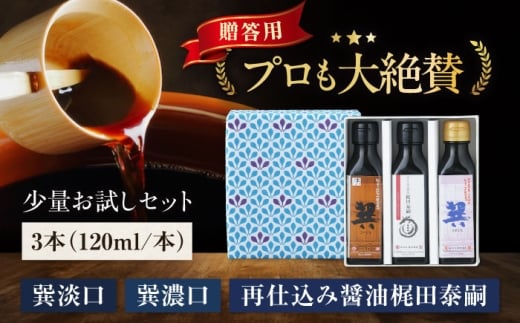 醤油 【贈答用】 お試しセット(巽淡口 巽濃口 再仕込み醤油梶田泰嗣)120ml×3本セット こいくち うすくち さいしこみ しょう油 万能調味料 和食 刺身 寿司 冷奴 焼き魚 煮物 炒め物 美味しい おいしい 調味料 しょうゆ セット 詰め合わせ 食べ比べ 国産 料理 つけ醤油 かけ醤油 おすすめ 人気 お取り寄せ 送料無料 贈答 ギフト 愛媛県大洲市/株式会社梶田商店[AGBB048]