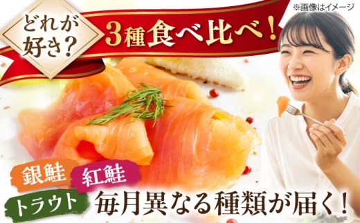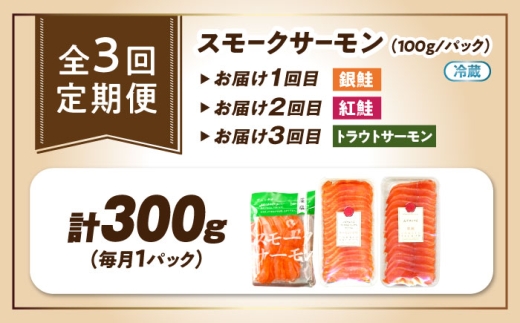 【全3回定期便】毎月異なる魚種が届く♪スモークサーモン1パック 滋賀県長浜市/株式会社中村屋 [AQAJ091] スモークサーモン サーモン 鮭 さけ しゃけ 定期便 魚介 海鮮 魚 銀鮭 紅鮭 トラウトサーモン トラウト おかず 惣菜 洋食 サラダ カルパッチョ サンドイッチ すし 寿司 スライス シーフード 小分け 滋賀県 長浜市 人気 おすすめ ギフト プレゼント