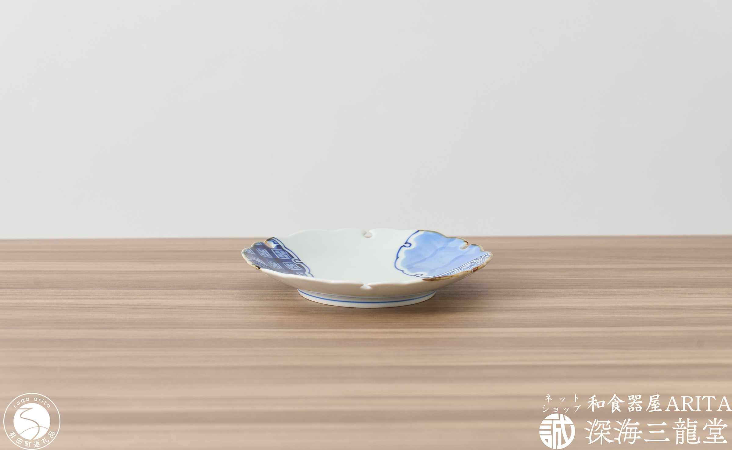 - 染付と赤絵雪輪皿 麻の葉 2枚 セット 深海三龍堂 有田焼 和食器 和風 小皿 銘々皿 取り皿 七宝 染付 青 赤 A24-91