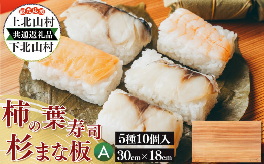 - 上北山村 × 下北山村 観光応援 共通返礼品 A 柿の葉寿司 ・ 5種 10個入 / 杉 の まな板 小 30cm×18cm | 和食 寿司 お寿司 海鮮 魚介 吉野 さば さけ あじ たい えび 食べ比べ 冷蔵 お取り寄せ グルメ 総菜 名産 特産品 郷土 調理器具 耐久性 弾力性 高級感 木目 無垢 一枚板 撥水性 防汚性 株式会社中谷本舗 スカイウッド株式会社 奈良県