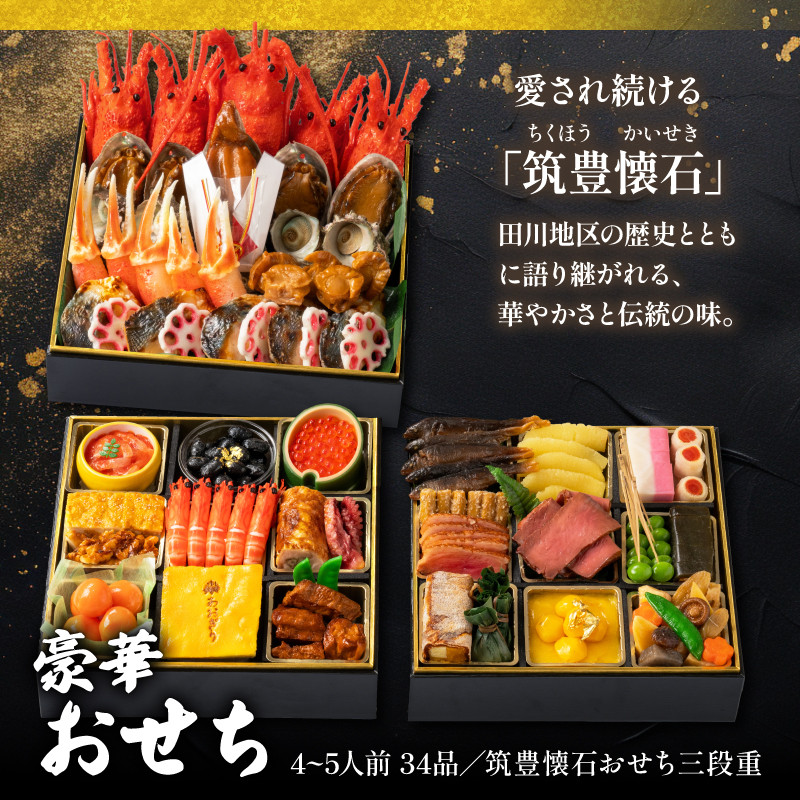 【12/31お届け】 おせち 4-5人前 冷蔵 三段重 (34品) 筑豊懐石おせち お節 おせち 2025 おせち 冷蔵 おせち oseti オセチ 4人前 おせち 5人前 懐石 おせち 料亭あおぎり 田川 川崎町 おせち