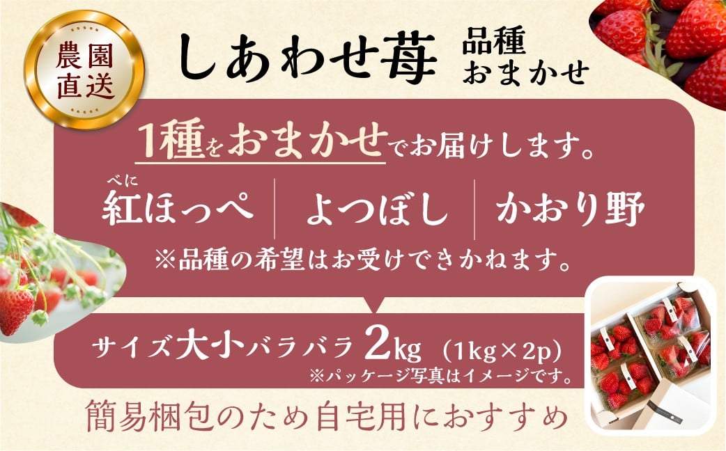 - 【2026年1月以降発送】 自宅用 品種おまかせ いちご2kg (1kg × 2セット) [しあわせ苺] サイズ バラバラ 訳あり 訳アリ 農園直送 フルーツ 果物 苺 イチゴ 子ども 大人 人気 小分け 簡易梱包 家庭用 産地直送 紅ほっぺ よつぼし かおり野 先行予約 岐阜 期間限定 [mt1799_25] family農園watanabe
