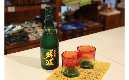 - 【比嘉酒造】泡盛残波と読谷の工芸品セット<ギフト箱入> 〇 琉球ガラス RyukyuGlassWork 沖縄 読谷村 プレミアム 古酒 5年 35度 伝統工芸品 読谷山花織 テーブルセンター グラス 芳醇 セット商品