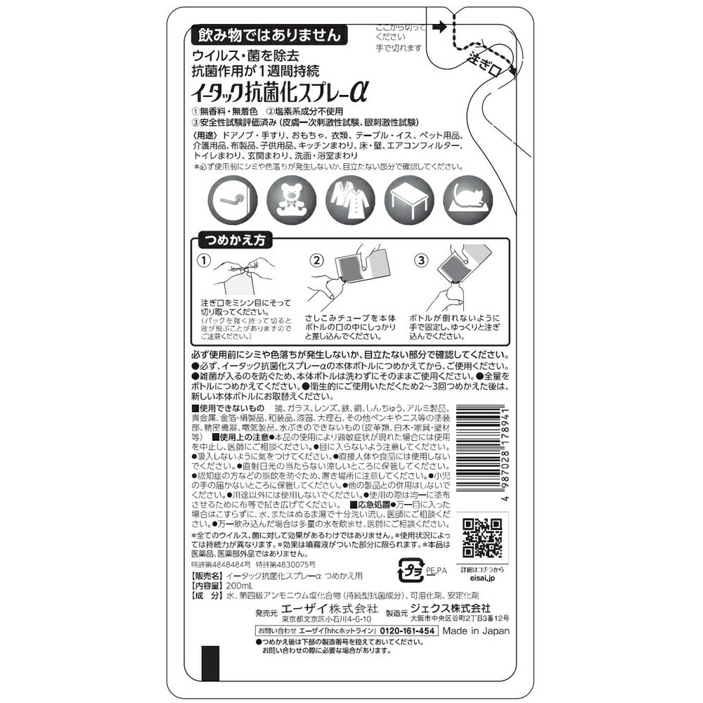 - 【ふるさと納税】エーザイ イータック抗菌化スプレーα(ノンアルコールタイプ)250mlスプレーボトル×1本&200ml詰め替え用パウチ×3個 | 兵庫県 丹波篠山市 気になるところに「シュッ 」として「サッ」と拭くことで、ウイルス・菌を除去、抗菌作用が1週間持続