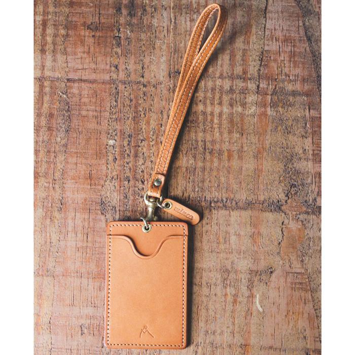 - 【minca】栃木レザーのストラップ付タテ型パスケース 定期入れ 職人の手仕事 パスホルダー01+ストラップS/キャメル