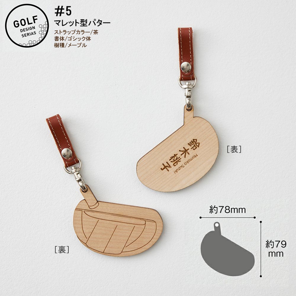 - ゴルフ ネームプレート 木製 両面デザイン 本革ストラップベルト 刻印 名入れ (#5:マレット型パター)【四国加工】