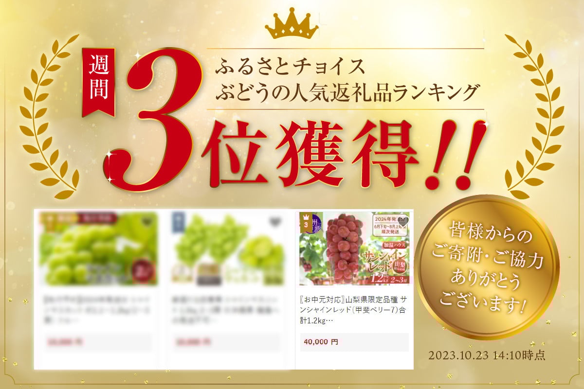 - クール配送[お中元対応]山梨県限定品種 サンシャインレッド 合計1.2kg以上【2026年発送】(MS)F-111 【サンシャインレッド ぶどう 葡萄 ブドウ 令和8年発送 期間限定 山梨県産 甲州市 フルーツ 果物 クール便】