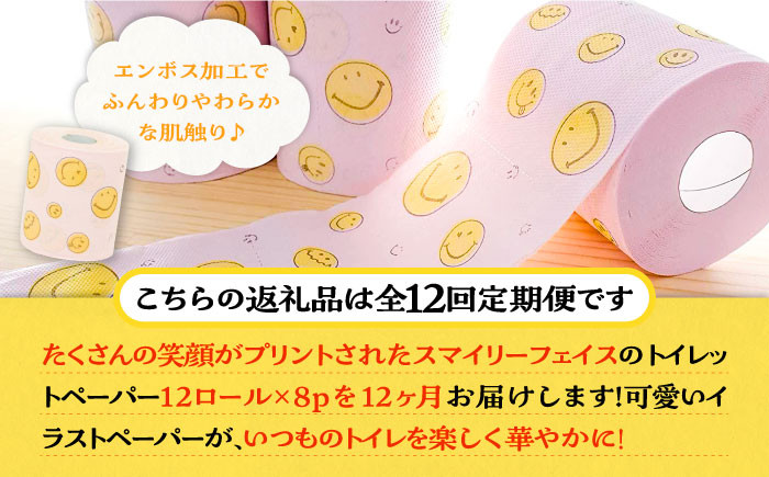 - 【全12回定期便】トイレットペーパー ダブル 25m 12ロール×8パック スマイリーフェイス 《豊前市》【大分製紙】 [VAA027] 備蓄 防災 まとめ買い 日用品 消耗品 常備品 生活用品 大容量 トイレ