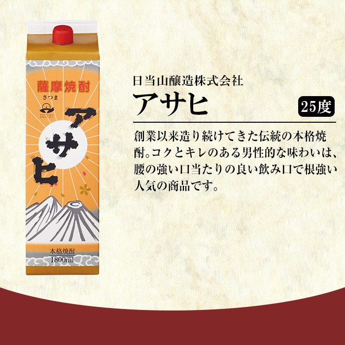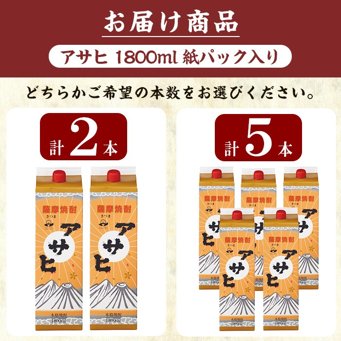 - K-652 《選べる本数》鹿児島本格芋焼酎「アサヒ」1800ml 紙パック入り(計2本・5本)【赤塚屋百貨店】霧島市 いも焼酎 紙パック 酒 老舗酒屋 厳選 地酒 日当山醸造