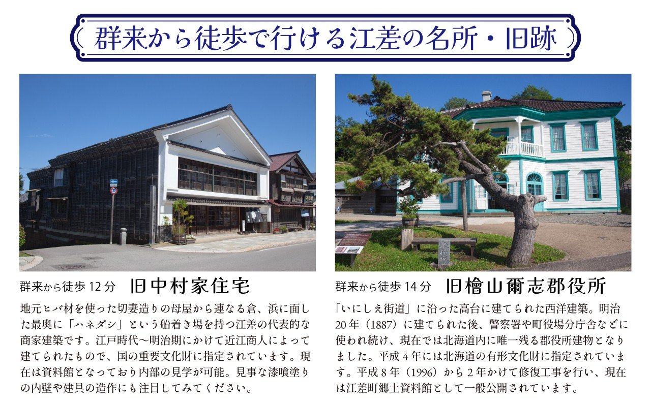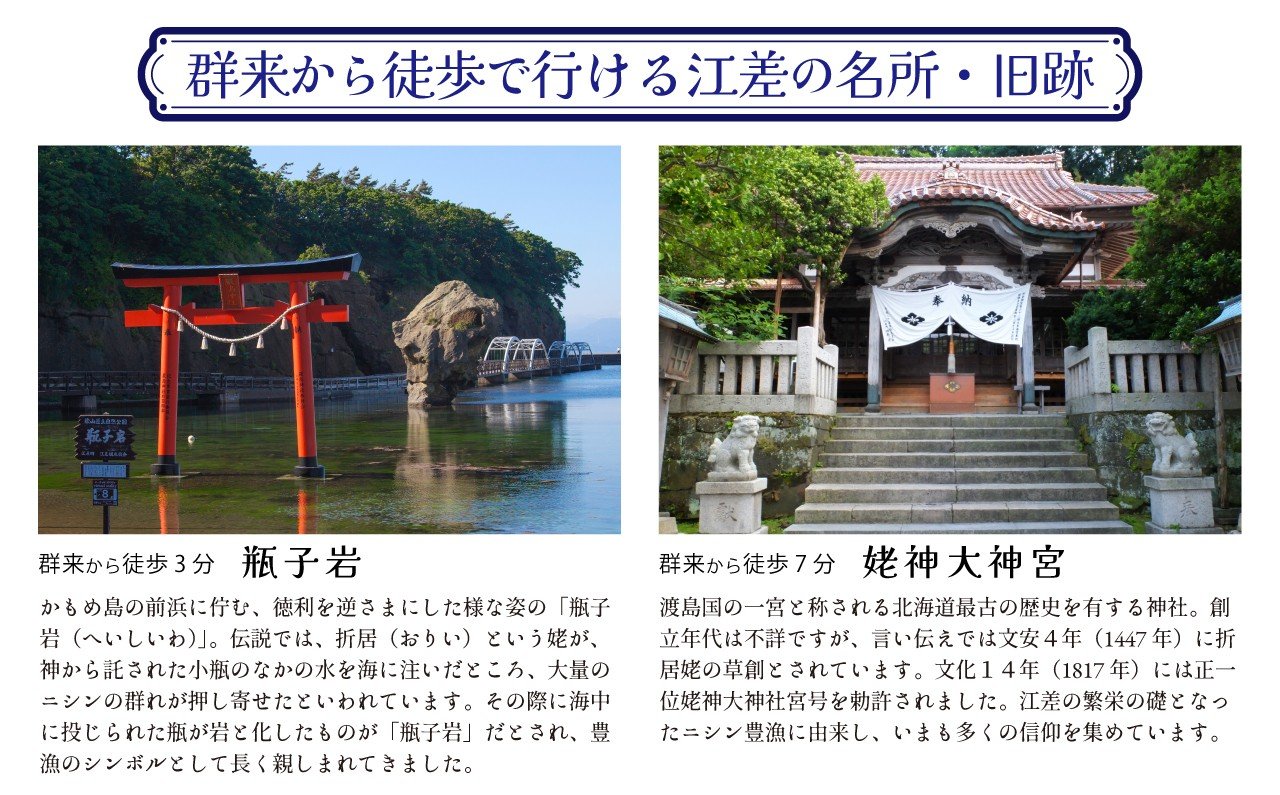 - 「2泊3日連泊・町歩きガイド付きプラン※期間限定7・8月除く」江差旅庭 群来(くき)《おひとり様宿泊券》 北海道の高級旅館 大人の隠れ家 源泉かけ流し天然温泉宿 個室温泉付き客室 直営農場の平飼い卵・サフォーク羊・野菜山菜 船買いの新鮮魚介理 温泉熱を利用した暖房給湯 食と環境にこだわった7部屋限定の癒しの宿 街歩き 観光ガイド 歴史的街並み散策 かもめ島