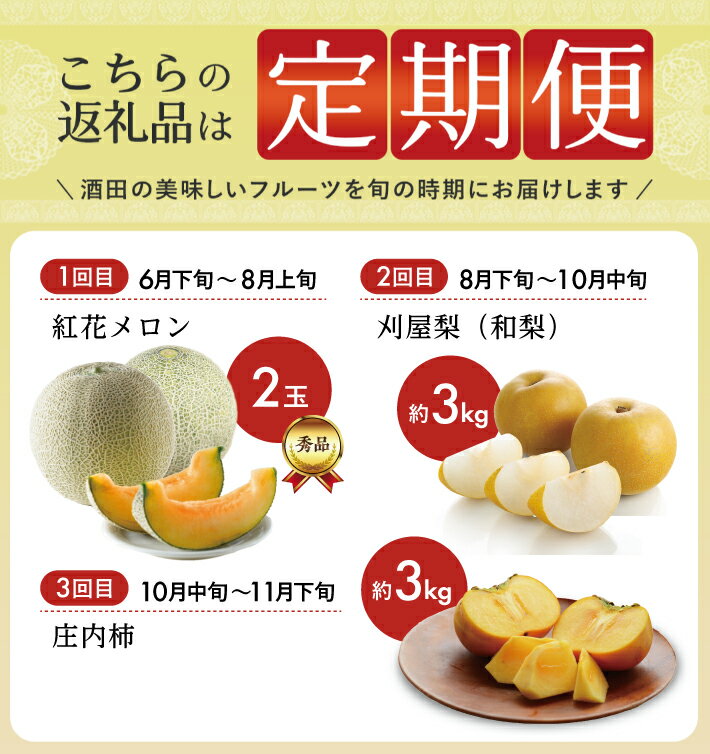 - 【ふるさと納税】≪3回定期便≫ 旬のフルーツ マルッとお届け便2026 6月下旬〜8月上旬:紅花メロン 8月下旬〜10月中旬:刈屋梨 10月中旬〜11月下旬:庄内柿 計3回 山形県酒田産 ※着日指定不可 頒布会 赤肉メロン 梨 和梨 柿 くだもの 果物 フルーツ 夏 秋 冬 旬 秀品