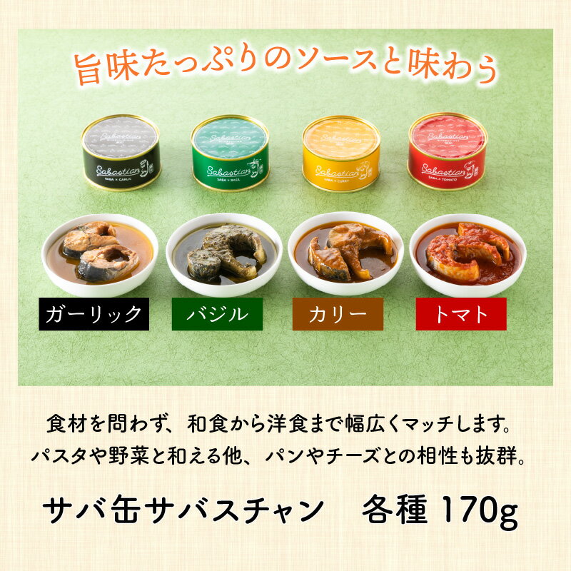 【ふるさと納税】【年内配送】サバ缶サバスチャン 4缶セット ガーリック バジル トマト カレー|福井県小浜市 キャンプ アウトドア 鯖缶 おつまみ 保存食 [A-018020] [BFAM004]