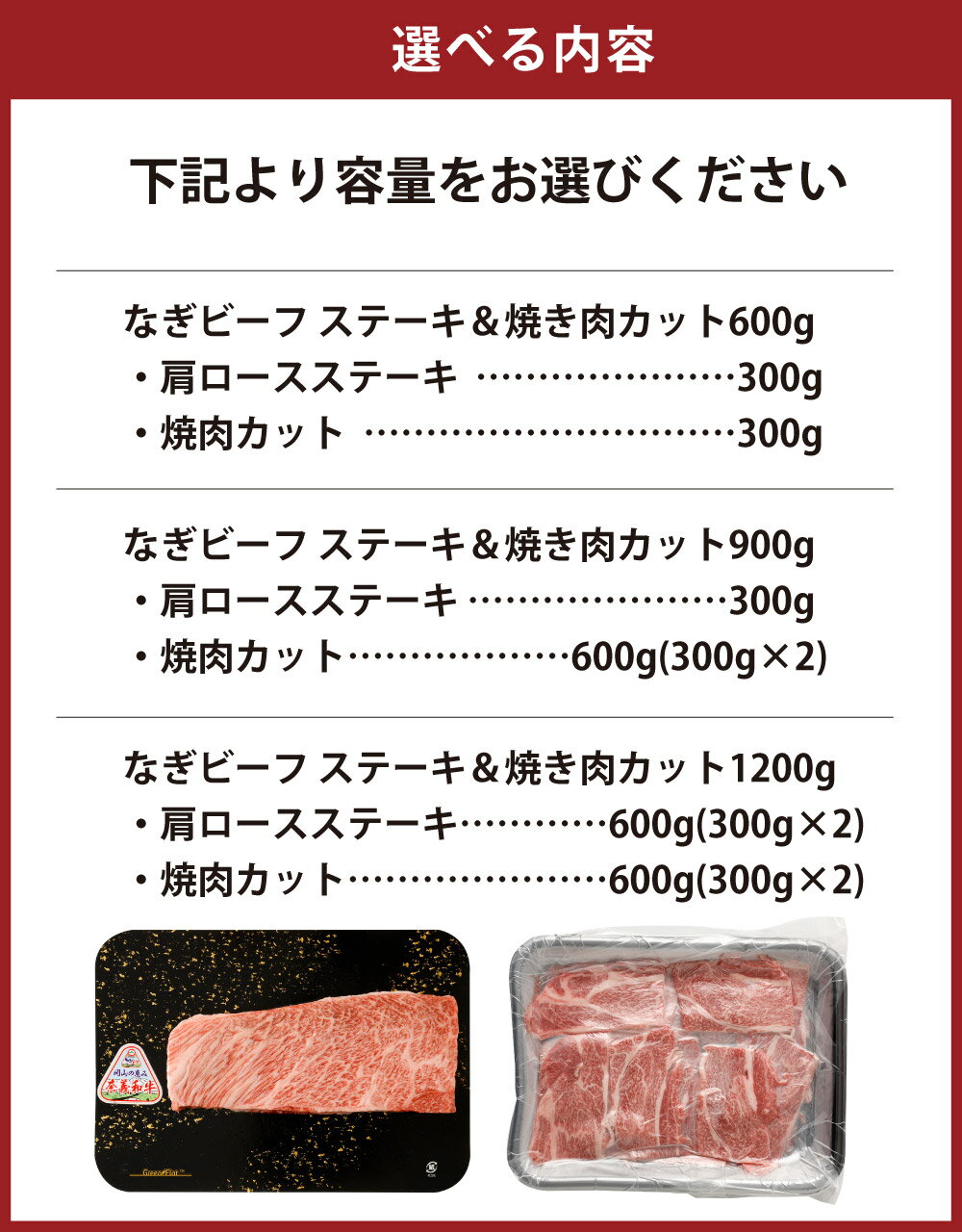 - 【ふるさと納税】なぎビーフ ステーキ & 焼肉カット 2種 セット〈選べる〉合計 600g / 900g / 1.2kg ステーキ 焼肉 カット 各300g~600g 牛肉 お肉 4等級以上 冷凍 岡山県産 国産 岡山県 美咲町 送料無料