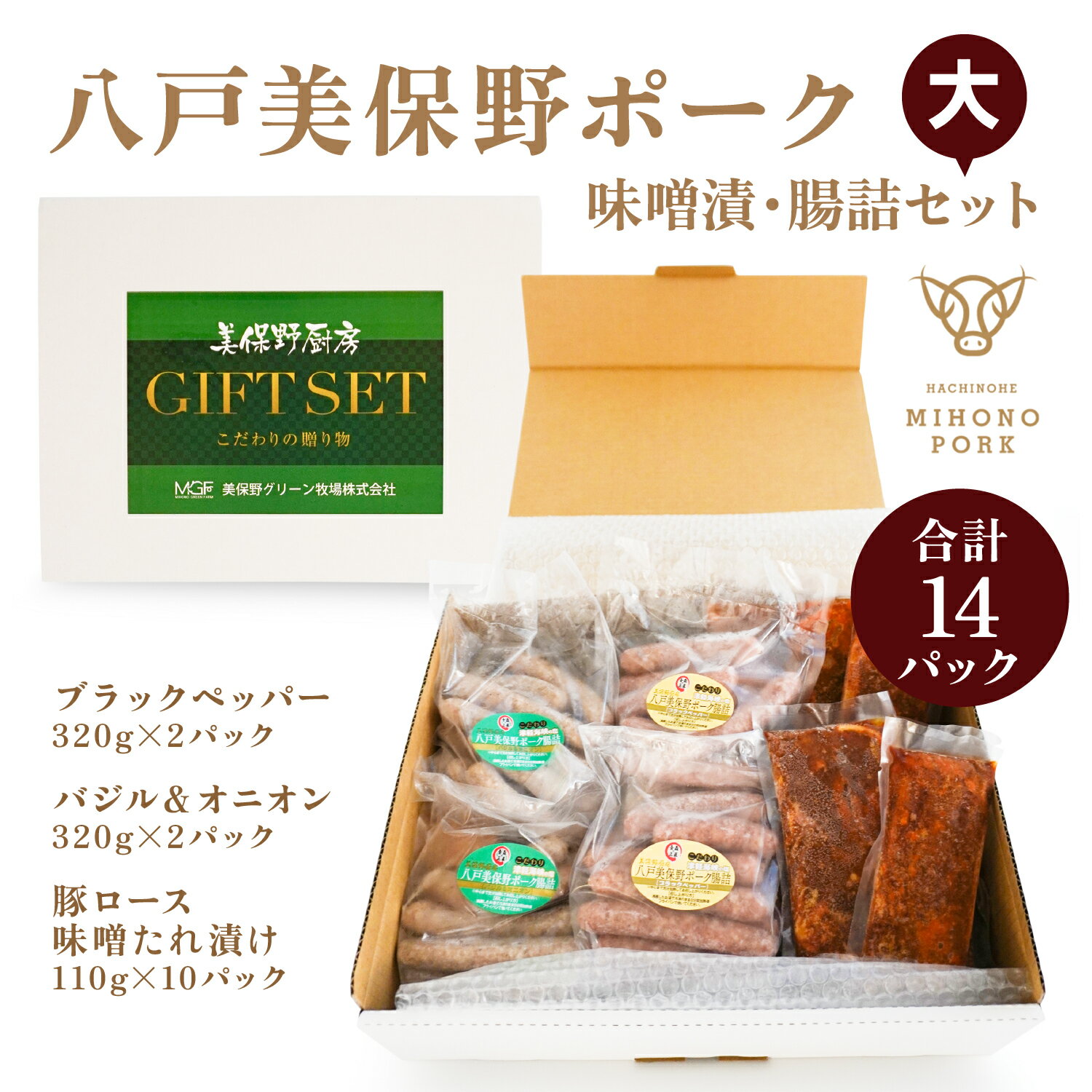 - 【ふるさと納税】八戸美保野ポーク味噌漬・腸詰セット [選べる容量]大 or 小 腸詰ブラックペッパー 320g 腸詰バジル&オニオン 320g 八戸美保野ポーク味噌漬 110g 計2380g or 計1190g 腸詰 ウインナー ロース 豚肉 青森県産 冷凍 送料無料