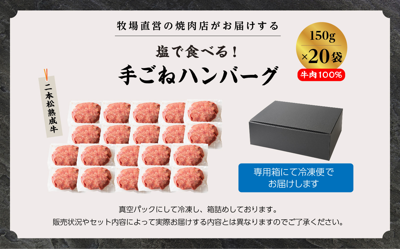 - \年内発送可能!/二本松熟成牛 塩で食べる!手ごねハンバーグ 3kg(150g×20袋) 国産 牛肉 ひき肉 ミンチ 小分け お取り寄せ グルメ 使いたい分 ハンバーグ 肉汁 生ハンバーグ おすすめ お中元 お歳暮 ギフト 二本松市 ふくしま 福島県 送料無料【有限会社エム牧場】