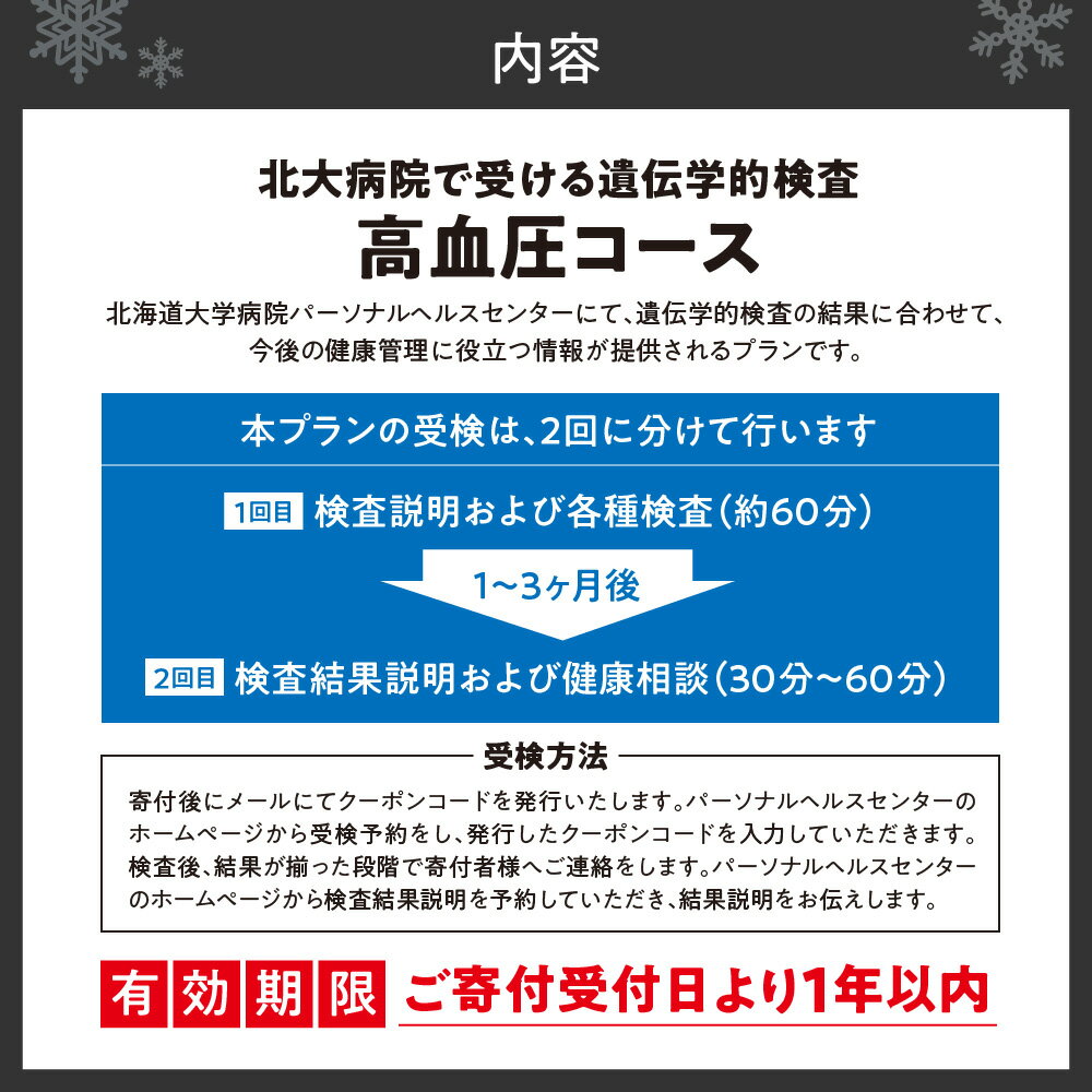- 【ふるさと納税】 遺伝学的検査 高血圧 コース 北海道大学病院 北大病院 パーソナルヘルスセンター PHC 遺伝子 ゲノム DNA 解析 検査 受検 健康管理 病気予防 健康 サポート クーポンコード 北海道 札幌市