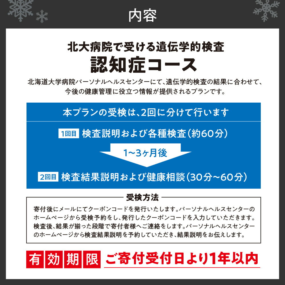 - 【ふるさと納税】 遺伝学的検査 認知症 コース 北海道大学病院 北大病院 パーソナルヘルスセンター PHC 遺伝子 ゲノム DNA 解析 検査 受検 健康管理 病気予防 健康 サポート クーポンコード 北海道 札幌市