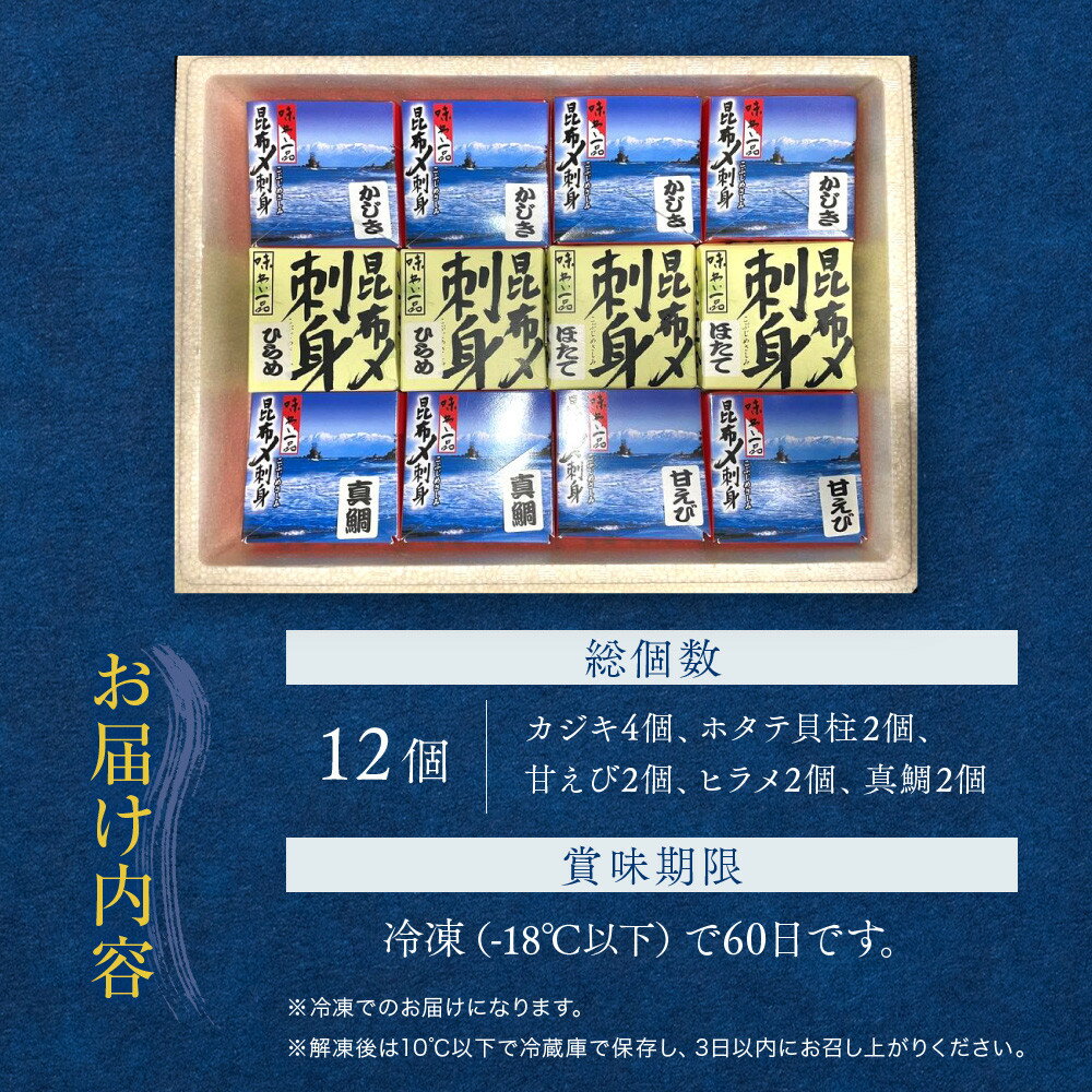 - 【ふるさと納税】味わい一品 手造り昆布〆セット 12個入 | 冷凍 昆布締め カジキ ホタテ貝柱 甘えび ヒラメ ひらめ 真鯛 タイ 海鮮 魚 お魚 さかな 父の日 母の日 酒のあて 人気 おすすめ 送料無料