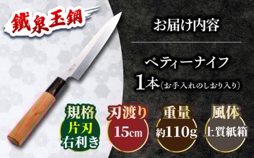 ナイフ 鐵泉玉鋼 ペティーナイフ 片刃(右利き)15cm 玉鋼 鉄 鉄師 たたら製鉄 雲南 特産品 工芸品 包丁 ナイフ ペティーナイフ 贈り物 贈答品 お祝い 記念品 キッチン用品 果物 ご当地 銘品 工芸品 本格的 国産 職人 鋼 たたら吹き 和鉄 デザイン 刀匠 雲南 奥出雲地方 刃物 島根県雲南市/株式会社たなべたたらの里(奥出雲前綿屋 鐵泉堂) [AIAV024]