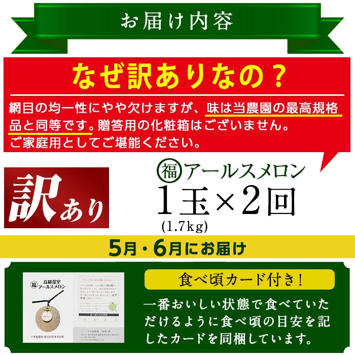 - 【0221105b】<訳あり!定期便・全2回(5月・6月)>マル福の高級アールスメロン(1玉×2回・計3.4kg)メロン フルーツ 果物 果実 3キロ 数量限定 期間限定【マル福園芸組合】