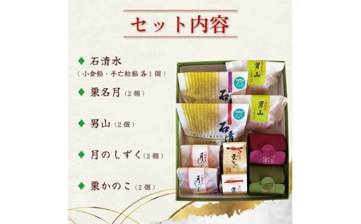 和菓子 詰め合わせ 石清水 栗名月 男山 月のしずく 栗かのこ 10個入り 化粧箱入り 餡 粒あん 白あん あずき ココナッツ クルミ 栗 甘露煮 スイーツ 和スイーツ お菓子 おかし おやつ ギフト プレゼント 贈答 贈り物 お祝い 御歳暮 お歳暮 お中元 記念日 人気 おすすめ 京都 京都府 八幡市 御菓子司 亀屋芳邦