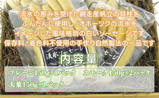 - 【数量限定】帆立貝柱入り【PREMIUM】流氷ソーセージ(網走産)3種(プレーン・スモーク・大葉)<網走産> 【 ふるさと納税 人気 おすすめ ランキング ソーセージ ウインナー ほたて ホタテ 帆立 網走産 プレーン スモーク 大葉 食べ比べ 北海道 網走市 送料無料 】 ABX008