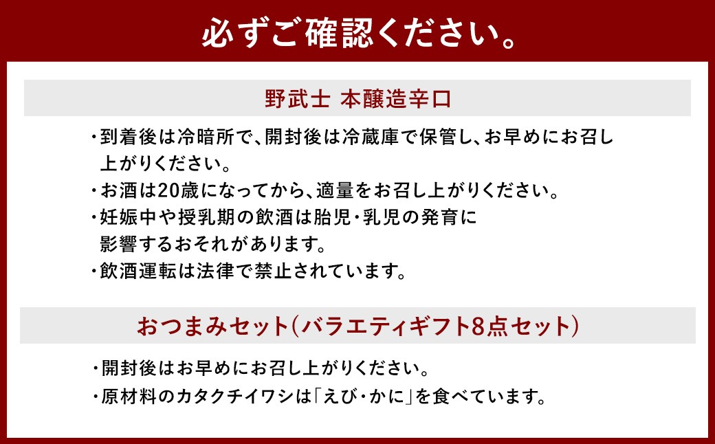 - 野武士 本醸造辛口 720ml おつまみセット(バラエティギフト8点セット) 日本酒 本醸造酒 酒 お酒 アルコール 飲料 瓶 おつまみセット おつまみ 厳選おつまみ 愛媛県 【えひめの町(超)推し!(砥部町)】(605)