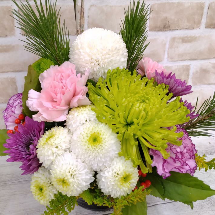 - 【ふるさと納税】お正月の花飾り マムとカーネのアレンジメント2026 2025年12月26日~12月28日にお届け ※着日指定不可 生花 フラワーアレンジメント 正月 新年 迎春 グリーンマム 白菊 カーネーション 松 寒竹 千両 植物 室内 屋内 玄関 床の間 インテリア