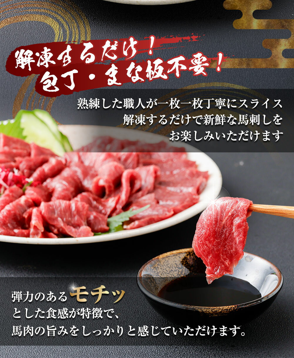 - 【ふるさと納税】<選べる定期便>【フジチク ふじ馬刺し】カット不要!切れてる馬刺し! 1回あたり計200g(50g×4人前) 1ヶ月毎 2回 / 3回 / 4回 / 5回 / 6回 赤身スライス 馬肉 お肉 馬刺し 馬刺 生姜 ショウガ しょうが たれ タレ 冷凍 熊本県 湯前町 送料無料