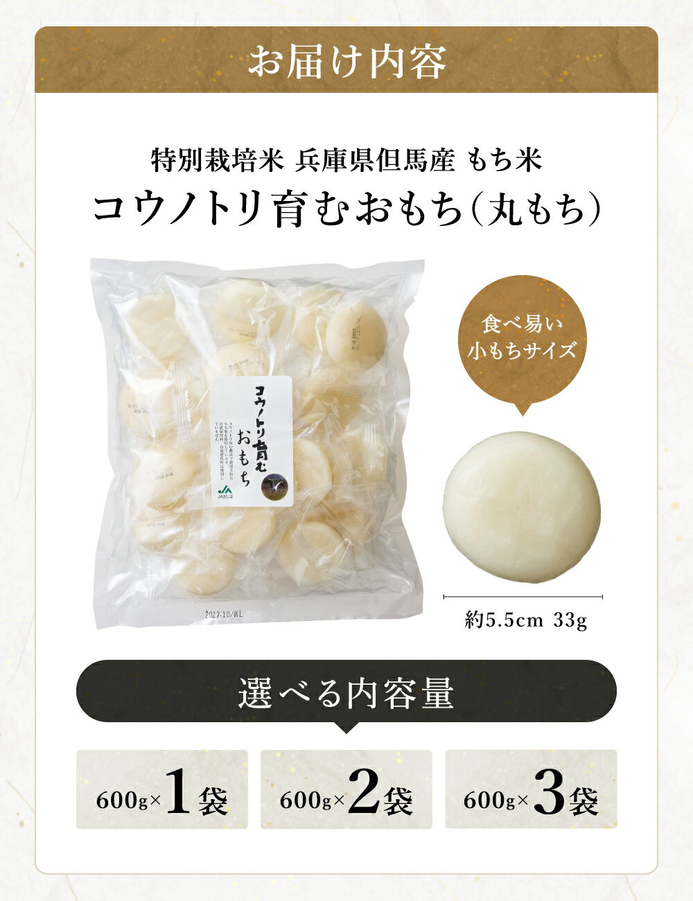 - 【ふるさと納税】特別栽培米 兵庫県但馬産 コウノトリ育むおもち(丸餅) 1袋 600g(約18個) 選べる1袋・2袋・3袋 / 農薬・化学肥料不使用 無添加 切り餅 個包装 無農薬 化学肥料不使用 但馬産 添加物不使用 常温保存 国産 おもち お餅 餅 まる餅 白餅 焼き餅 雑煮 正月
