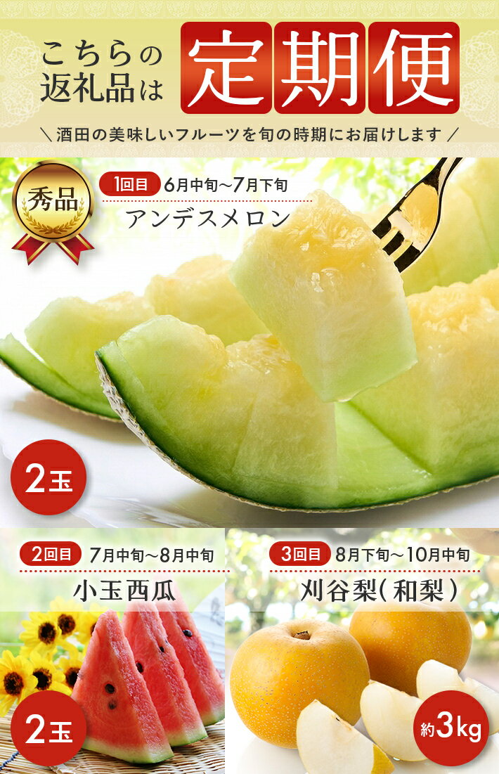 - 【ふるさと納税】≪3回定期便≫ 果汁がひろがる!酒田の美味しい果物お届け便2026 6月中旬〜7月下旬:アンデスメロン 7月中旬〜8月中旬:小玉スイカ 8月下旬〜10月中旬:刈屋梨(和梨) 計3回 山形県酒田産 ※着日指定不可 頒布会 青肉メロン 西瓜 和梨 くだもの 果物 夏 秋 旬