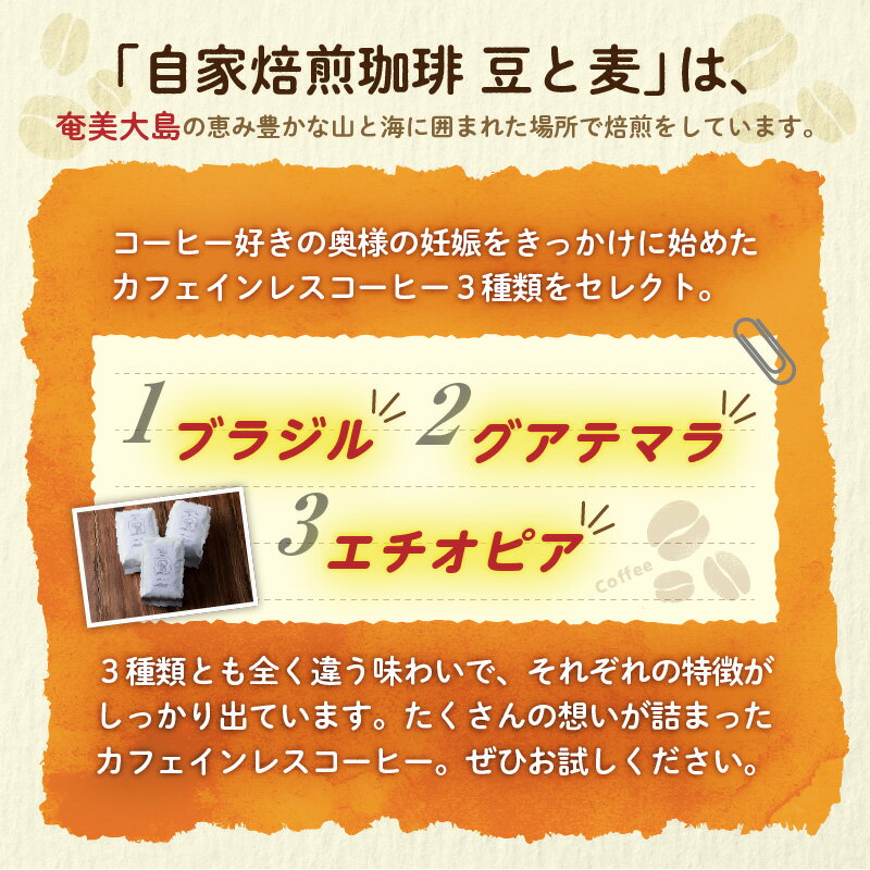 【ふるさと納税】<選べる>自家焙煎 カフェインレス コーヒー豆 粉 200g 3種類 ご自宅用 ギフト用 飲み比べ ブラジル グアテマラ エチオピア コーヒー 珈琲 家カフェ 妊娠中 授乳中 のし対応可 自家焙煎珈琲 豆と麦 鹿児島 奄美市 おすすめ ランキング プレゼント ギフト