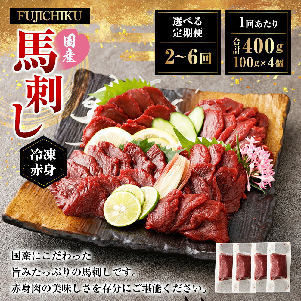 - 【ふるさと納税】<選べる定期便>【フジチク】国産 馬刺し 赤身 1回あたり計約400g(約100g×4個) 1ヶ月毎 2回 / 3回 / 4回 / 5回 / 6回 馬肉 お肉 赤身肉 馬刺し 馬刺 生姜 ショウガ しょうが たれ タレ 冷凍 熊本県 湯前町 送料無料