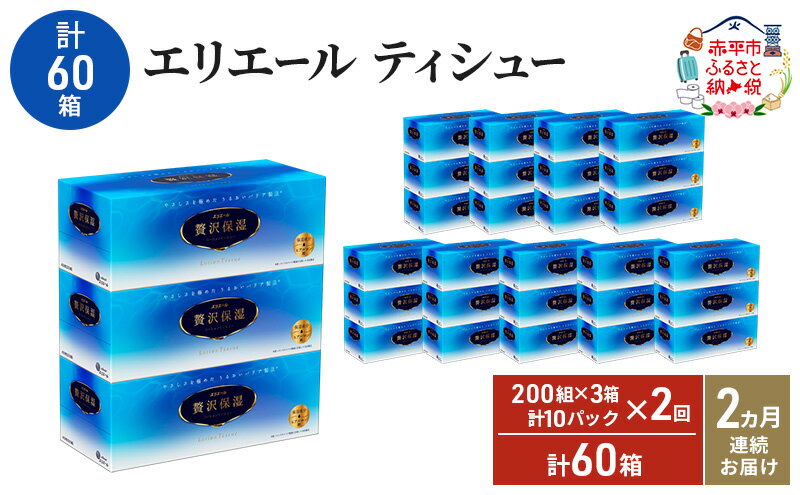 - 【ふるさと納税】2ヵ月連続お届け 計60箱 エリエール 贅沢保湿 200W3P 10パック ティッシュペーパー 箱ティッシュ ボックスティッシュ 保湿成分配合 紙 まとめ買い 防災 常備品 備蓄品 消耗品 日用品 生活必需品 送料無料 赤平市 お届け:2026年3月31日まで
