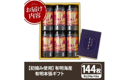 - 【初摘み海苔使用】有明本張ギフト 福岡有明のり(計144枚・8切24枚×6本) 海苔 のり ノリ 初摘み 有明のり 有明海苔 おにぎり 常温 常温保存 小分け 福岡県 有明海産 【木村食品】as46-019