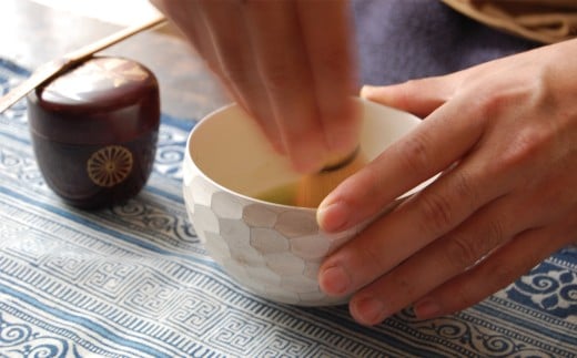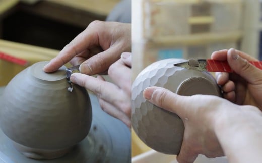 - 【萬古焼(ばんこやき)】愛着が色にでる茶器。焼き上がりから、使い込む程に色が変わる。萬古焼の新鋭アーティスト岡井翼。ひとつひとつダイヤの形を彫り込んだ「銀彩ダイヤカット茶椀」【岡井翼 銀彩 ダイヤ 1点もの 三重県 四日市市 四日市】