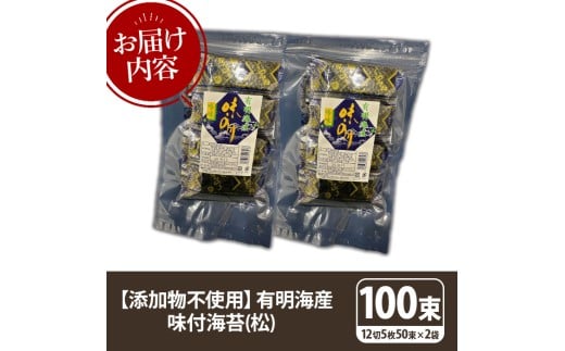 【松】味付海苔 福岡有明のり 添加物不使用(計100束・12切5枚50束×2袋) 海苔 のり ノリ 有明のり 有明海苔 味付け海苔 おにぎり 常温 常温保存 小分け 福岡県 有明海産【木村食品】as46-020