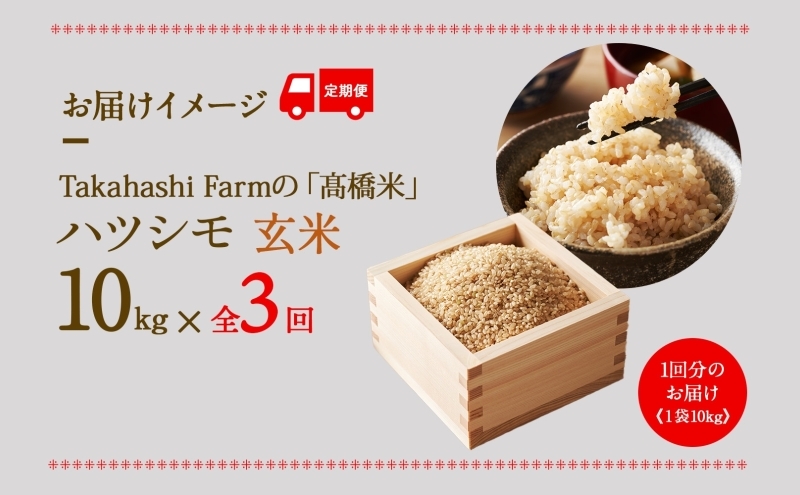 - [№5568-0419]全3回お届け定期便 岐阜県 揖斐川町産 ハツシモ「高橋米」玄米 10kg×1袋 お米 精米 玄米 ごはん 米 ご飯 はつしも ブランド米 大粒米 白米 炊飯 冷めても美味しい お弁当 冷凍保存 ライス 主食 ふっくら お取り寄せ 送料無料 揖斐川町