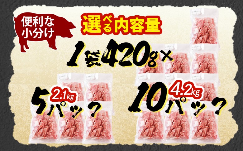 数量限定 選べる内容量<豚肉切り落とし 合計2.1kg(420g×5)/4.2kg(420g×10)>【レビューキャンペーン】 豚肉 国産豚 九州産豚 豚小間 国産 九州産 南九州産 精肉 脂身 赤身 料理 普段使い 小分け 便利 小間切れ 豚こま 薄切り 袋 炒める しゃぶしゃぶ お肉 お弁当 おかず 夕食 一品 生姜焼き 豚汁 冷凍食品 保存【MI476-nk-_oya】【中村食肉】