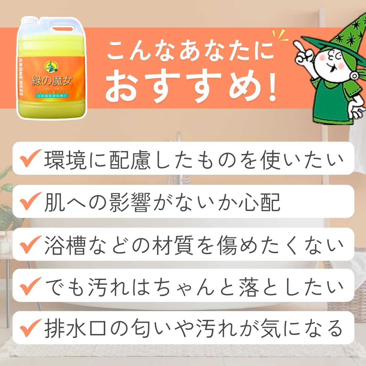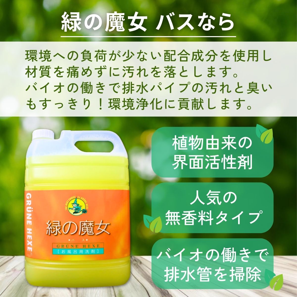 緑の魔女バス5L×1本 洗剤+パイプクリーナー 次世代型環境配慮型洗剤 | 茨城県 龍ケ崎市洗剤 液体 環境配慮 バス用 浴槽 湯あか 大容量 1万件以上の口コミ 世界中で愛される ヌメリ 皮脂汚れ 中性タイプ 日常品 お風呂洗剤 バス用洗剤 大容量 業務用 口コミ人気 人気 湯あか 防カビ 中性 手にやさしい
