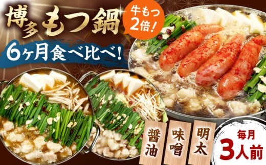 【全6回定期便】 【牛もつ2倍!】【ご家庭用】もつ鍋3種定期便(明太・味噌・醤油)3人前 桂川町/株式会社 海千 [ADAR040]