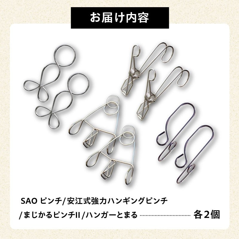 - 安江式ステンレスお試しファミリー「SAOピンチ」「強力ハンギングピンチ」「まじかるピンチⅡ」「ハンガーとまる」各2個セット 【 ステンレス お試しセット アイデア 便利 簡単 耐久性 新生活 洗濯 家事 タオル バスタオル 国産 シンプル 洗濯バサミ 強風対策 生活雑貨 丈夫 長持ち 洗濯グッズ 職人】