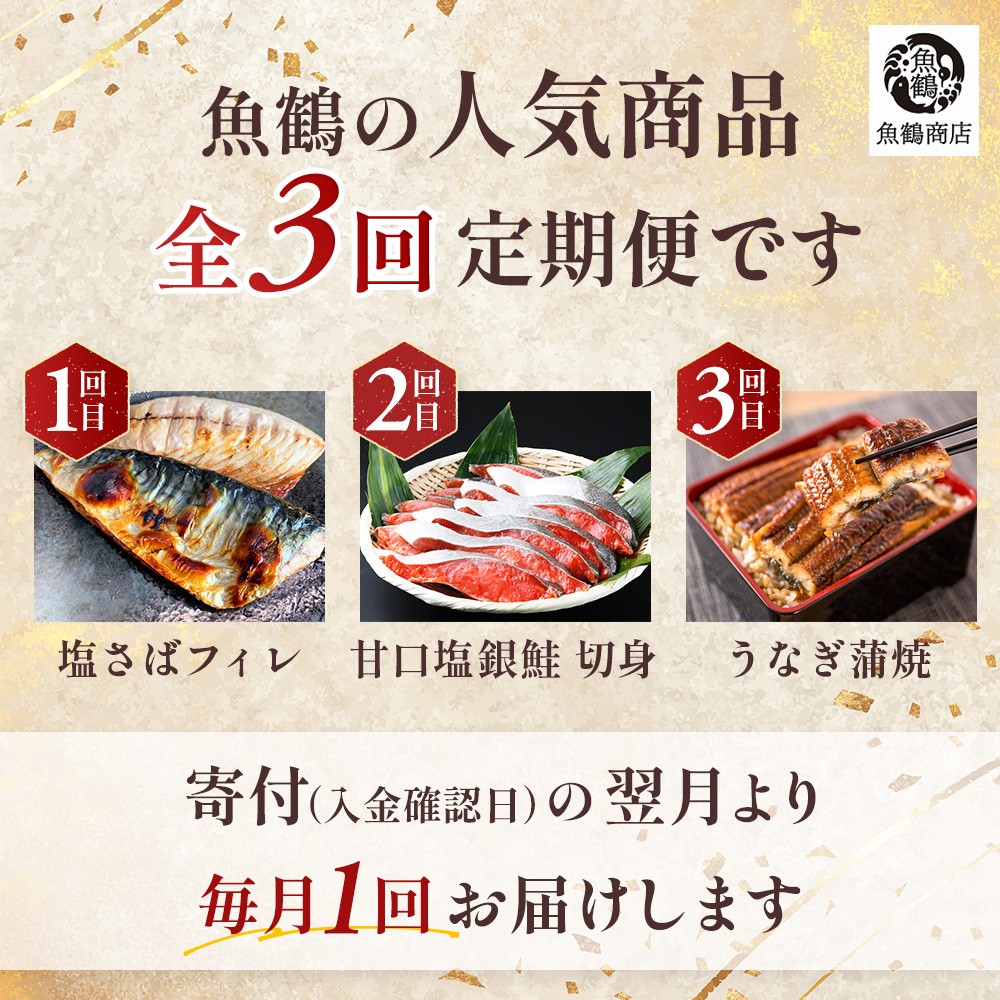 - 【全3回定期便】魚鶴厳選!人気のお魚集合定期便(さば・銀鮭・うなぎ)/ 定期便 海鮮 鯖 鮭 さけ 鰻 塩鯖 塩さば 厳選 和歌山県 由良町 魚 海鮮 料理 調理 さかな 国産 【tkb307】