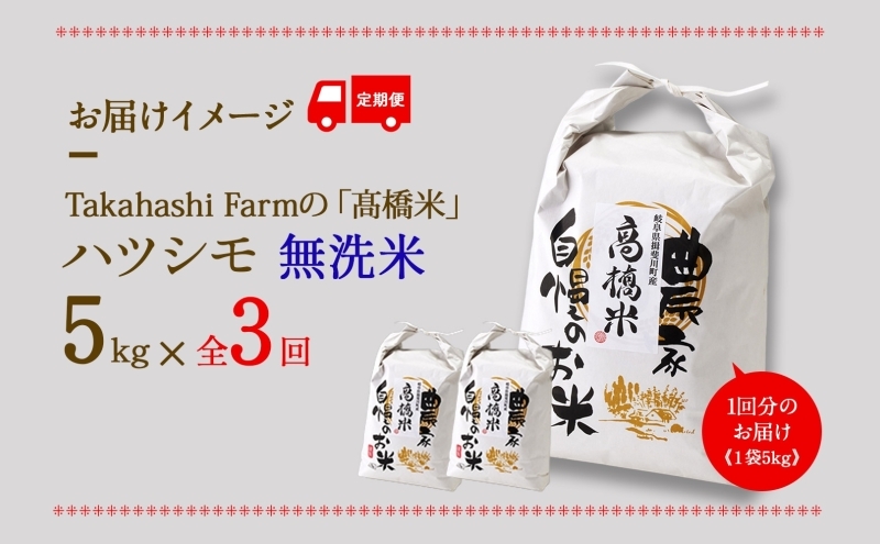 [№5568-0425]全3回お届け定期便 岐阜県 揖斐川町産 ハツシモ「高橋米」無洗米 5kg×1袋 お米 精米 白米 ごはん 米 ご飯 はつしも ブランド米 大粒 炊飯 冷めても美味しい お弁当 冷凍保存 主食 ふっくら お取り寄せ お取り寄せ米 送料無料 揖斐川町