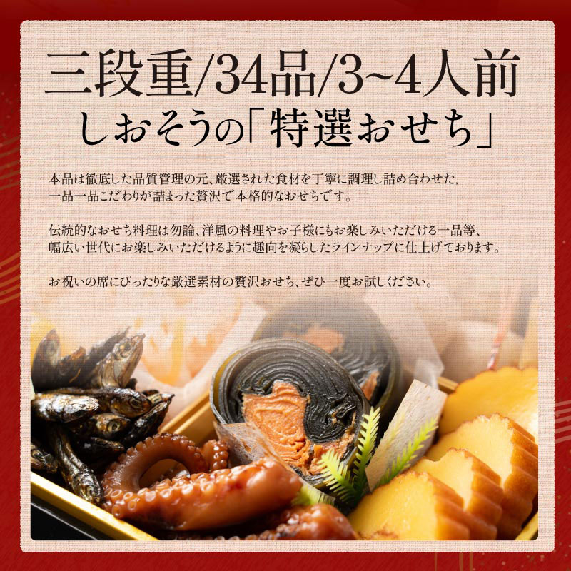 [先行予約・数量限定] 【12月30日お届け】しおそう オリジナル 『 迎春 おせち 』 3段重 [34品 3~4人前]