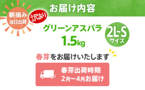 - 数量限定 先行予約 【訳有り】【規格外】 アスパラガス 春芽 2L~S 1.5kg【2月〜4月お届け】|朝採り 朝採れ 直送 グリーンアスパラガス アスパラ BT04